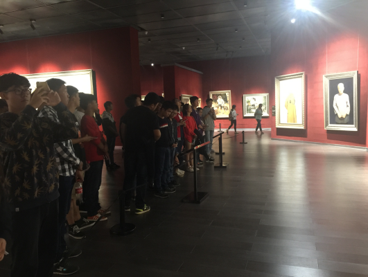 观展期间,李自健馆长热情地为师生们讲解了每幅作品。同学们一边观展一边聆听每幅画的故事,看到感兴趣的画,同学们都会久久驻足并拍照留存。这一次观展活动,让学生领略了艺术魅力,激励了他们的创作热情,同时在一定程度上提高了他们的艺术修养和艺术品位。