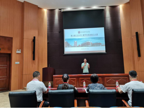为加快推进辅导员队伍专业化、职业化建设,全面检验学管一线理论水平和综合能力,学院于7月13日至14日举办了第六届辅导员素质能力大赛。大赛特邀湖南生物机电职业技术学院学工部部长何忠、湖南大众传媒职业技术学院学工部部长杨黄江、湖南劳动人事职业学院学工部部长吴志兵,以及学院公共教学部(思政课部)主任王含光、副教授周艳担任评委。来自六个专业系的27名专兼职辅导员参加了比赛。