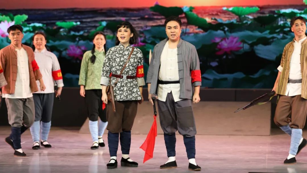 随后,音乐学院毕业生们复排的经典民族歌剧《洪湖赤卫队》精彩上演。该剧讲述了第二次国内革命战争时期,湘鄂西洪湖地区赤卫队及工农红军与国民党反动派及“湖霸”开展革命斗争的传奇故事。歌剧经典的唱段、紧凑的节奏、悠扬的旋律,充满了坚定乐观的革命精神,凸显了共产党人坚定的革命信仰及其与老百姓的鱼水深情。