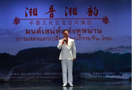中泰文化交流艺术团受湖南省文化和旅游厅委派,代表湖南出访泰国,印证了两国人民深厚友谊和友好交往。出访期间将在泰国举行三场以“湘声湘韵”为主题的演出,8月11日首演结束后还将于8月12日、8月14日分别在曼谷中国文化中心和诗洛卡琳威娜大学带来两场精彩演出。